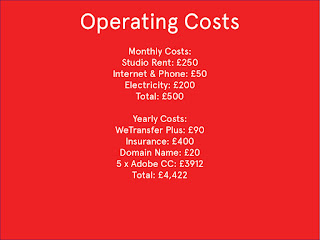 Monthly, we would be spending around £500 on the up keep of the studio it’s self. The yearly total costs would amount to roughly £10,422. Additional project costs, travel expenses, materials, researching and so on would be dependant on the brief and the specific client. In order to cover these expenses, we would need to charge £89 per hour, which has been rounded up to £100, meaning the extra money could go back into the up keep of the business. Therefore, we would expect to be earning around £4,005 per studio member a day. This would be achievable as we would in theory have multiple briefs on the go at once. We believe our target hourly rate is reasonable in todays current climate and in relation to ourselves as young professionals. This would also allow us to sustain the business in the first two years without going under.